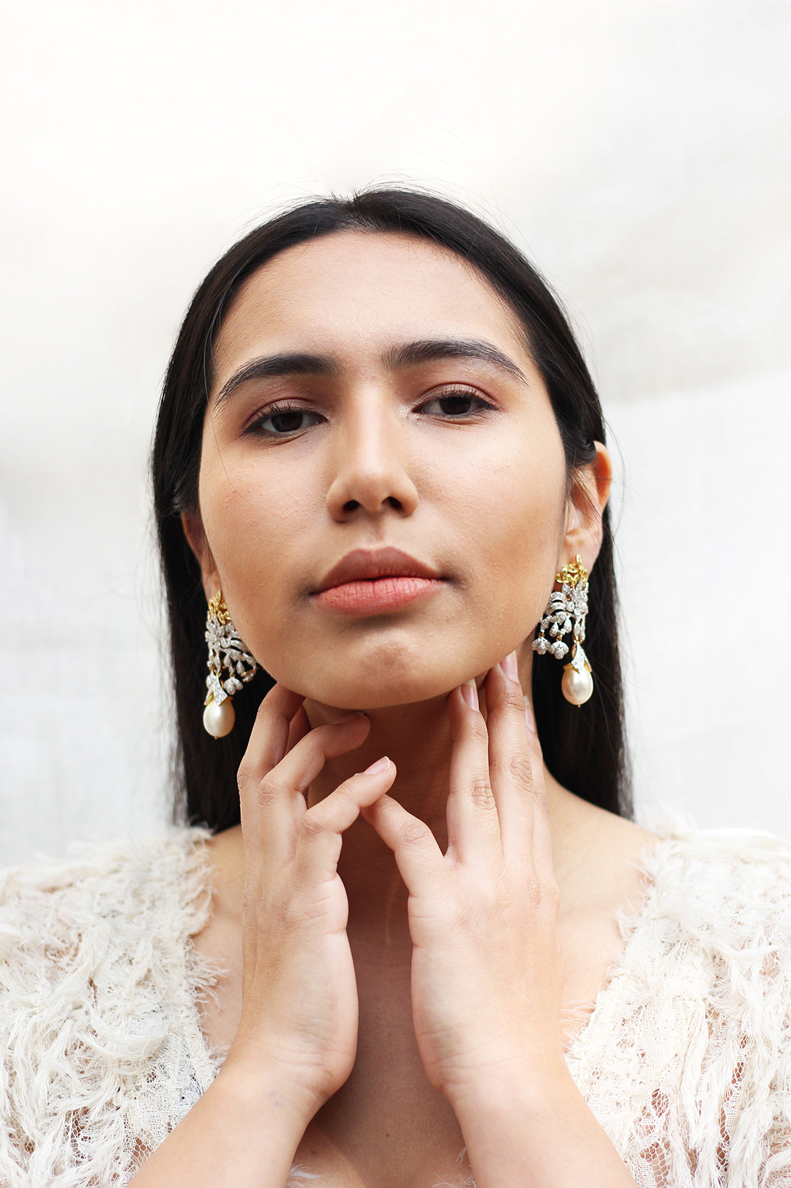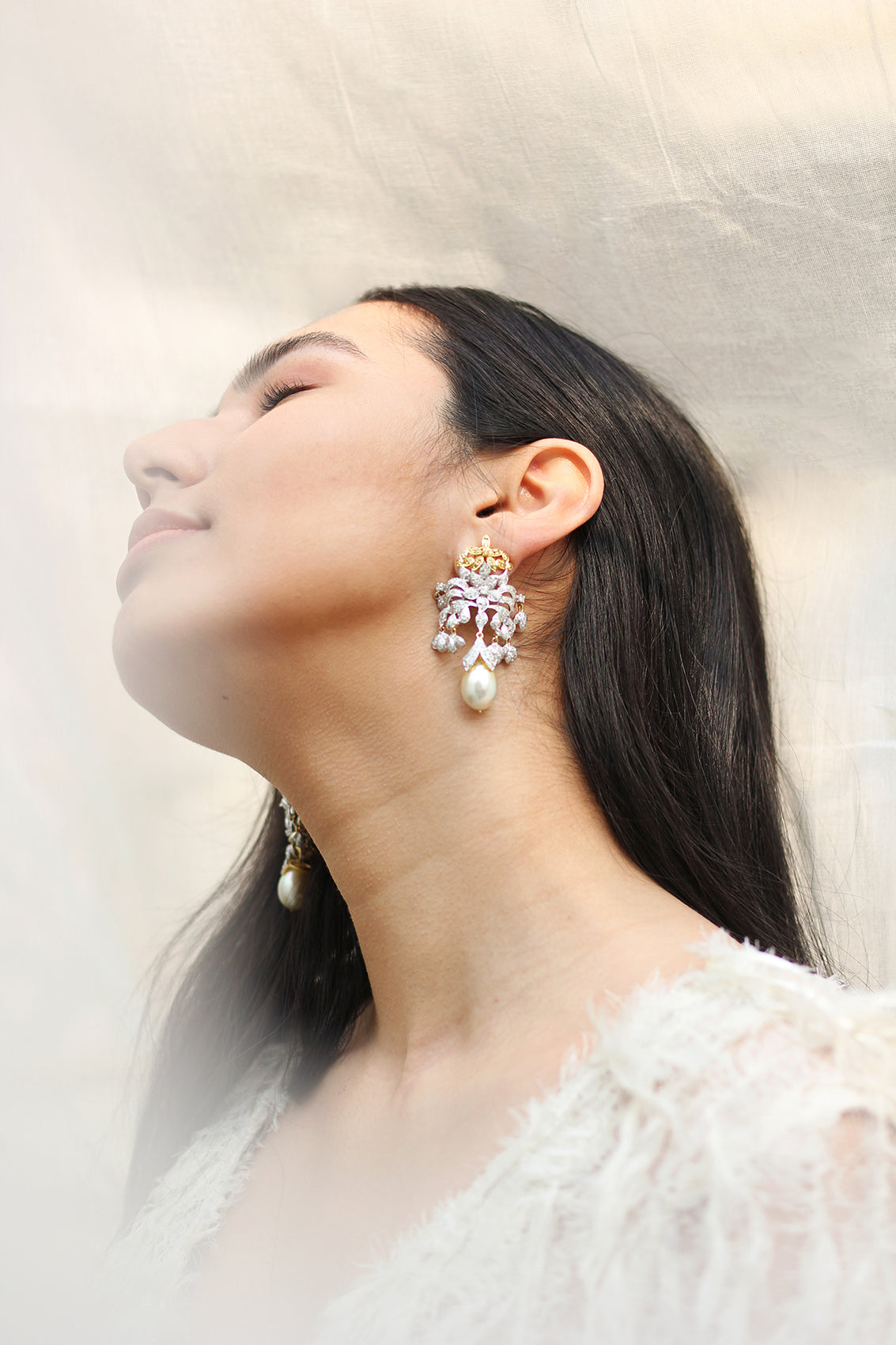 Each claw set yellow and white diamond, within a frame of ivy leaves these earrings fall delicately with a south sea pearl.