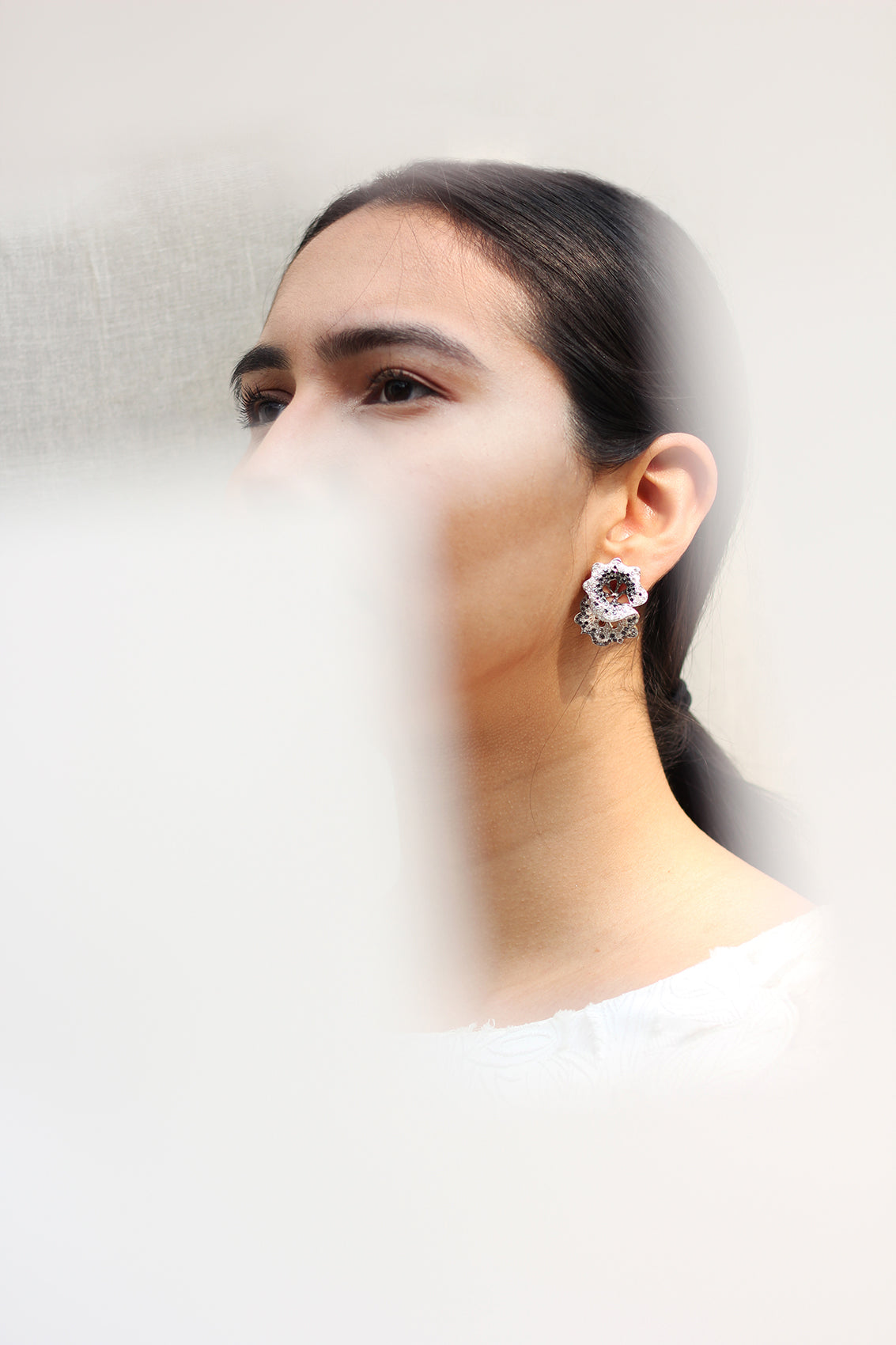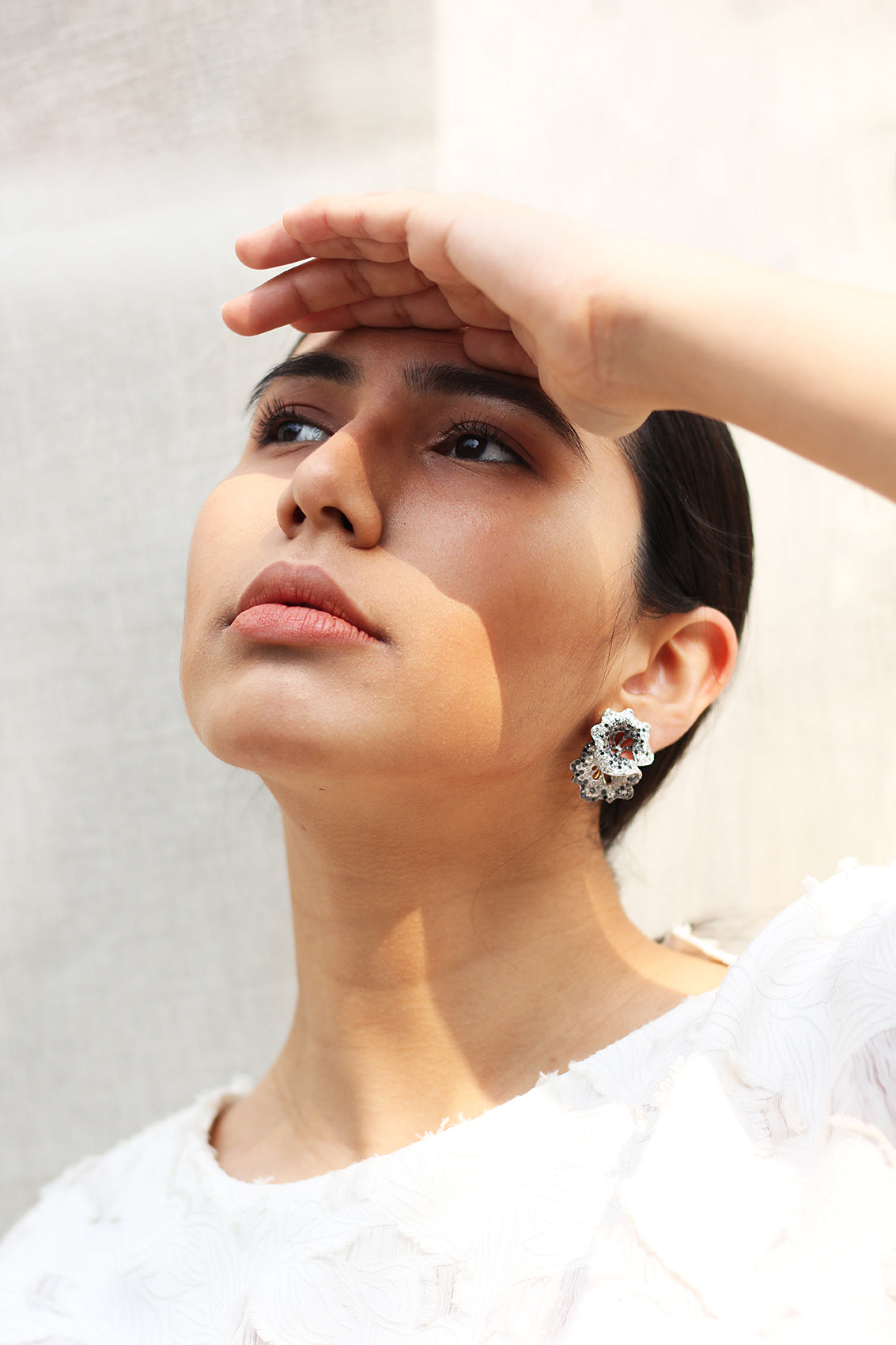Delicately crafted white gold spiral earrings featuring black and white diamonds