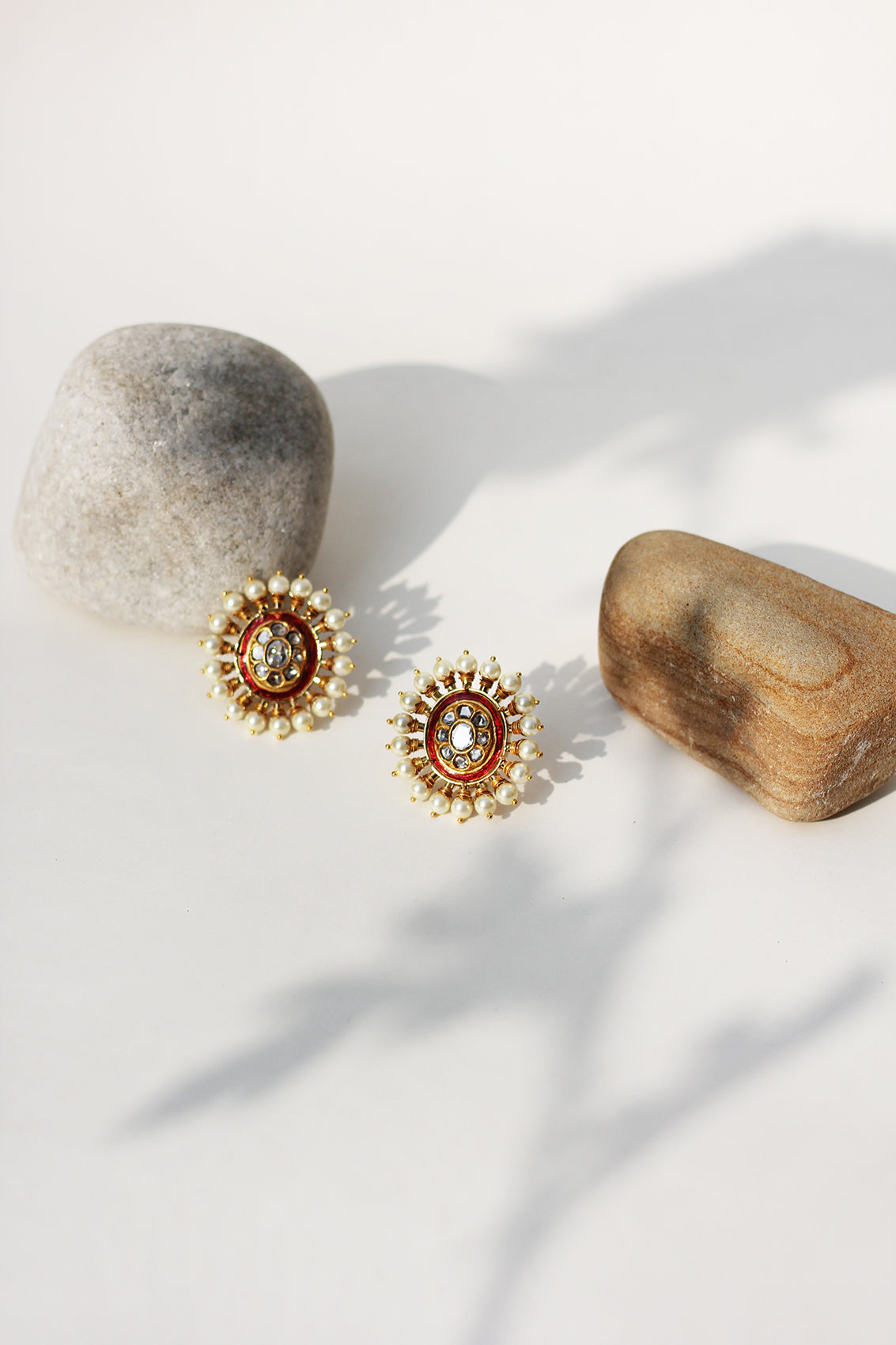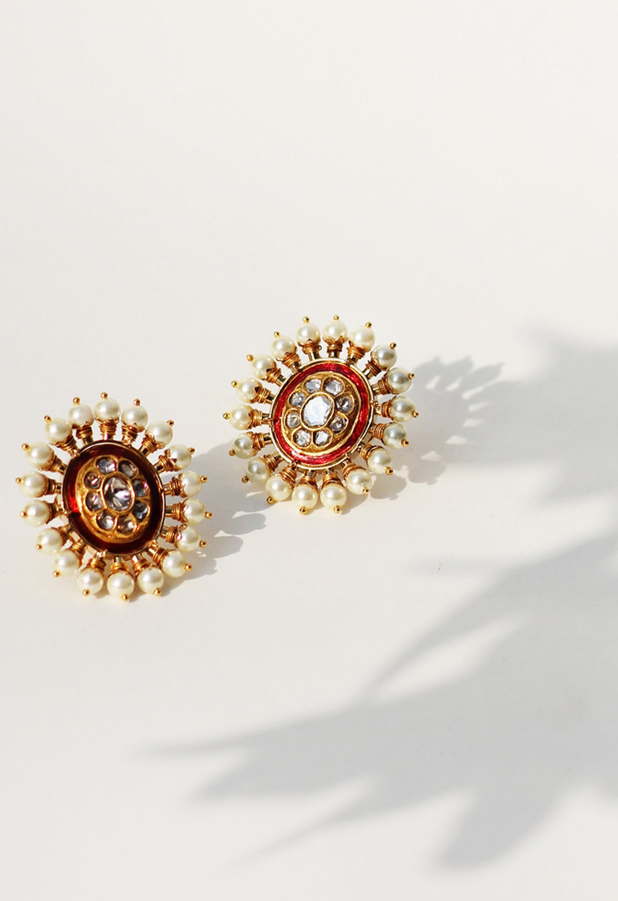 With traditional red meenakari and a richly crafted south sea pearl periphery set in 18k gold, these earstuds are a to go for all occasions.