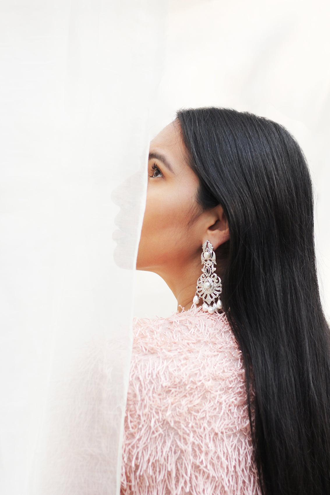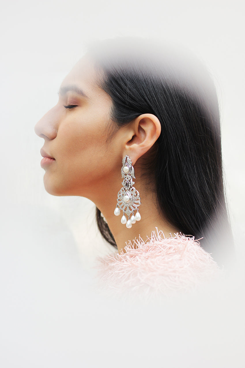 An opulent diamond foliage enclosed around drop shaped freshwater pearls, surrounded by white gold pave set diamonds all intricately hancrafted