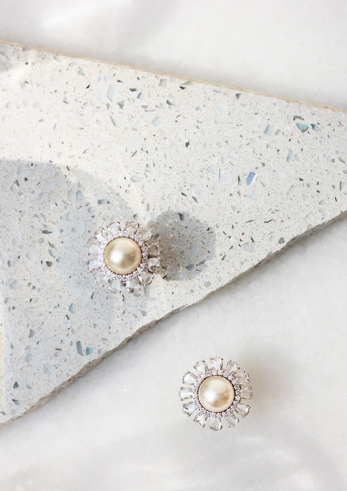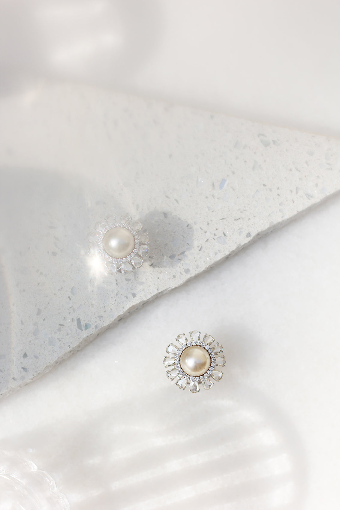 A Pure white pearl surrounded by circular pave set diamonds and pear shaped rose cuts in a floral overlay.